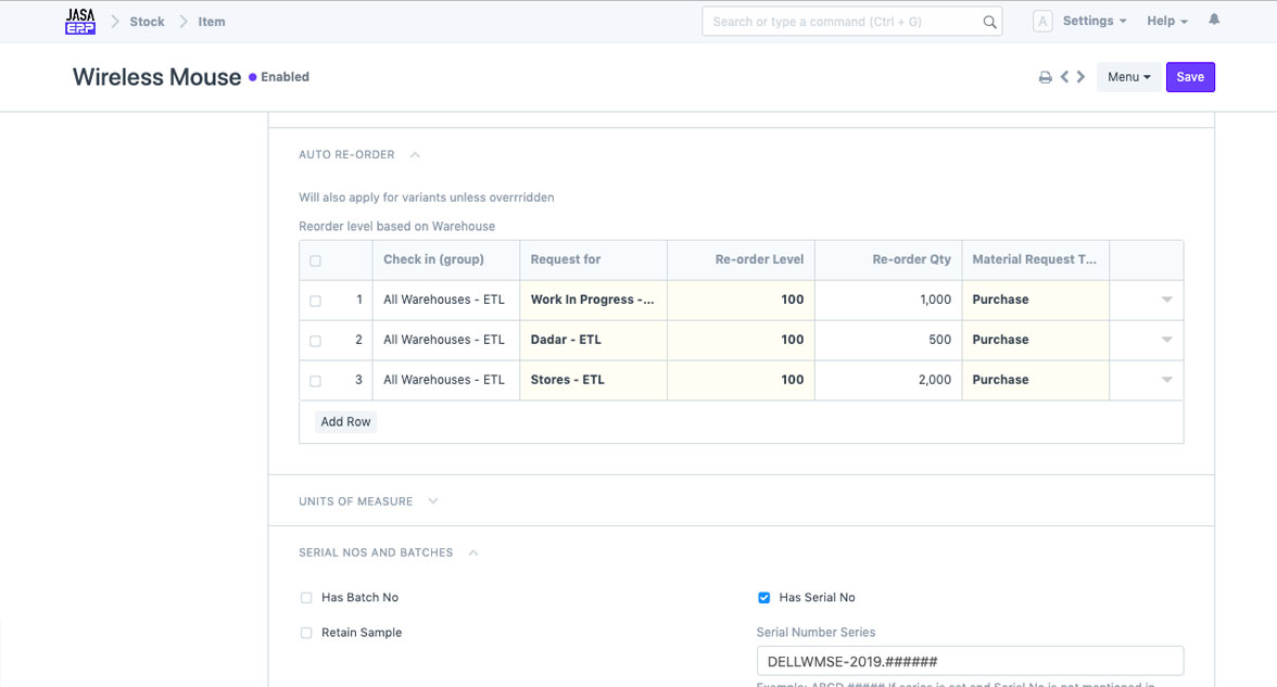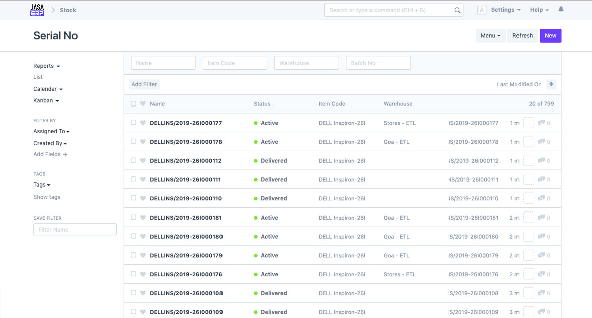 Gunakan nomor seri untuk mengidentifikasi setiap unit secara unik. Atur penamaan nomor seri (naming series), dan Jasa ERP akan secara otomatis membuat nomor seri untuk stok baru.